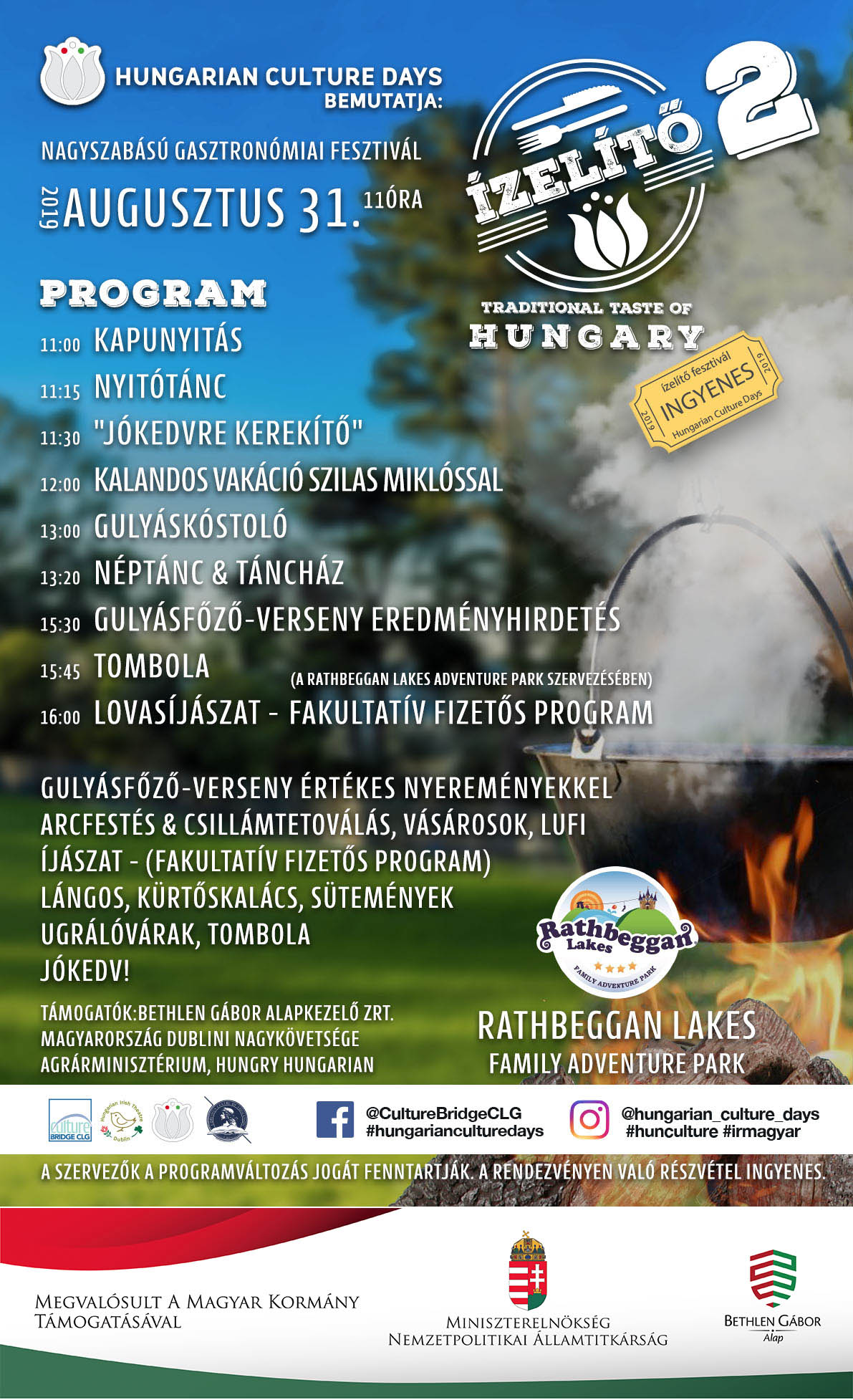Szeretettel várunk újra mindenkit az idei év legnagyobb, kültéri magyaros fesztiváljára 2019. augusztus 31-én, a Rathbeggan Lakes családi kalandparkba! Ízelítő a programokból: népzenei és néptáncos előadások, koncertek, gyerekeknek színes foglalkozások, ugrálóvárak és labirintus. A gasztronómia iránt érdeklődőket bográcsos főzőverseny és magyaros ételek széles választéka várja, egész napos kóstolóval.